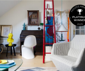 And, let’s not forget the importance of color to bring personality to a petite space. With a carefully selected color palette, we defined different areas. Neutral, serene tones in combination with natural materials, such as wood, and modern elements, such as metal, to create a sense of balance and harmony. To bring character and dynamism to the space, we opted for bold and vibrant colors, such as the blue sofa and the living room’s clay red custom-made furniture.
